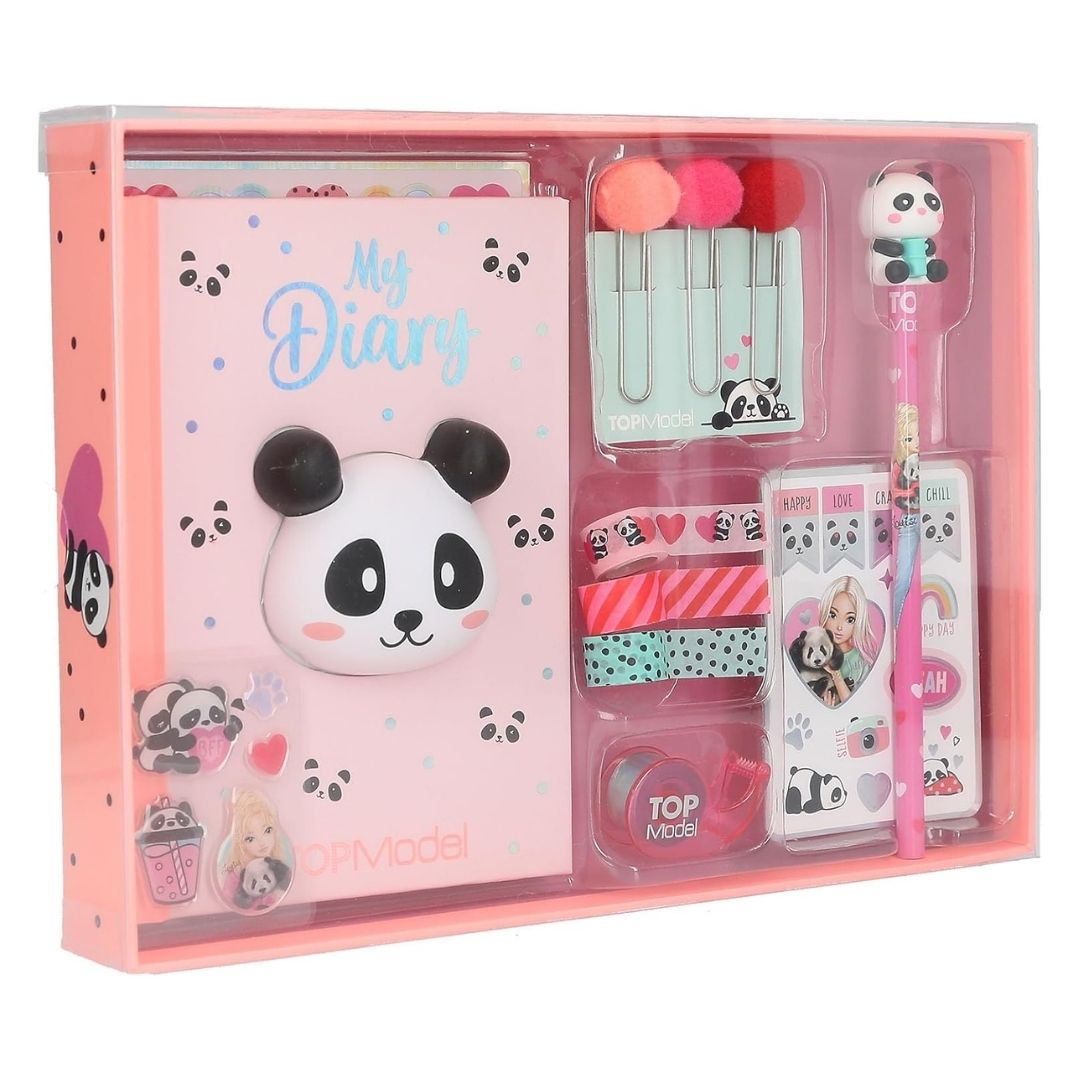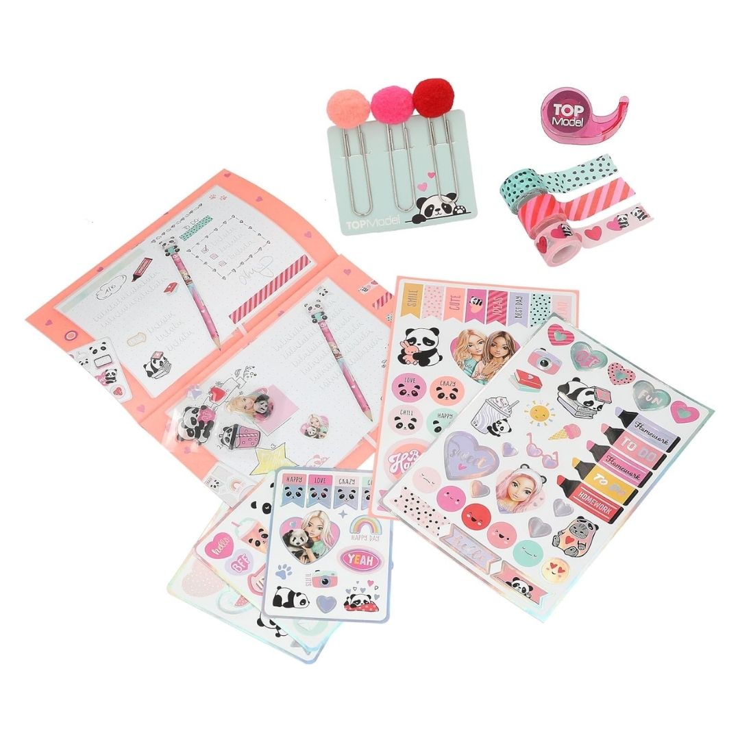 Panda Power! This adorable journal is waiting to be filled with secrets and dreams. Includes: 4 rolls of decorative tape with dispensers, 3 large paperclips with colorful pom-poms, 1 pink pencil with a panda topper, and tons of stickers to decorate the pages. The figurative panda head on the cover is a real eye-catcher and protects the journal. A small booklet is included for illustrative design ideas.