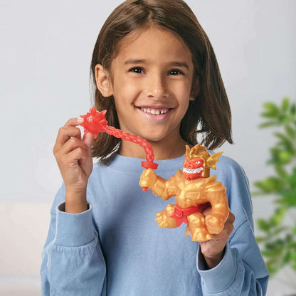 Prepare to be captivated by the NEW Heroes of Goo Jit Zu Deluxe Action Figures! Our favourite hero, Blazagon, makes a triumphant return, facing off against the formidable villain, Rock Jaw, in an epic showdown of upgraded proportions. Towering at an impressive 5.5 inches (14cm), Blazagon is eager to unveil his Stretch 'n' Strike abilities, ready to launch into battle at any time with his gooey, stretchy weapons. But the excitement doesn't stop there! Equipped with more than 20 battling sounds, and the ability to stretch up to three times his size, make sure to unleash his EPIC, LOUD stretch attack! Additionally, Blazagon now boasts enhanced battle armor, elevating the epicness of his clashes with an additional layer of defense! Endless excitement awaits with the two DELUXE heroes Blazagon & Rock Jaw! Collect them now!