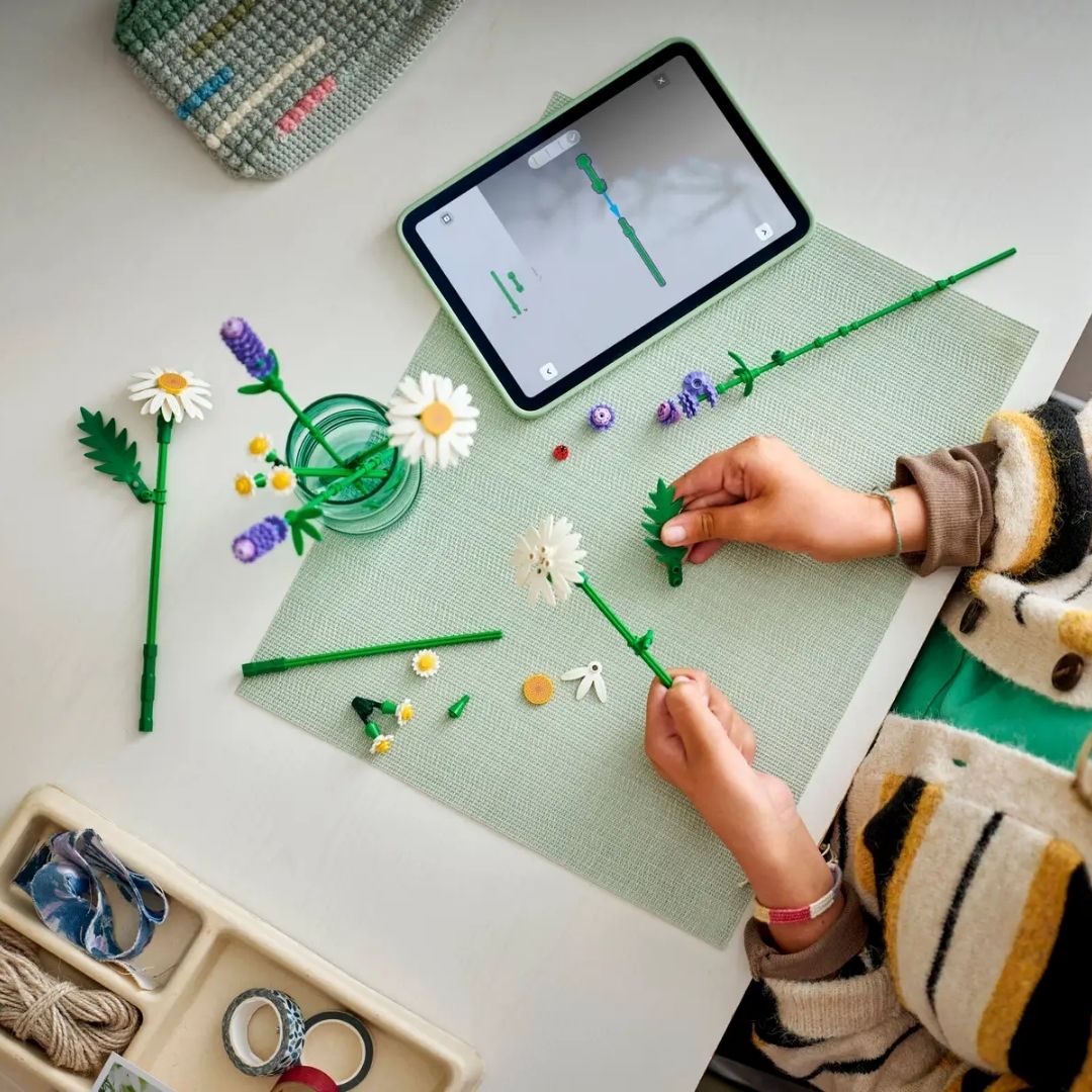 - LEGO® FLOWER BOUQUET – Budding florists will have fun building 3 large daisies, 2 stems of small daisies, 3 calming lavenders and vibrant green stems