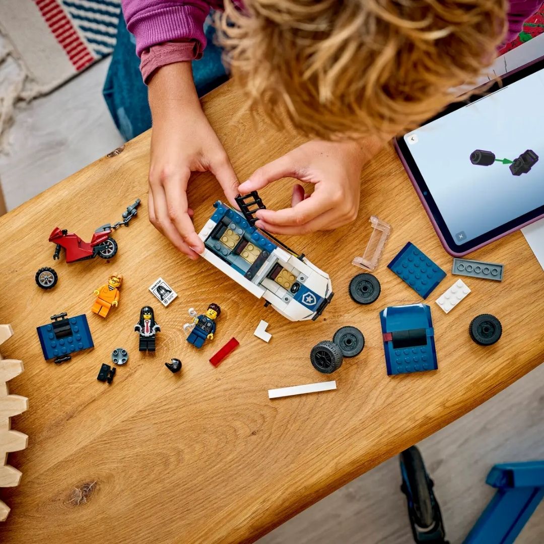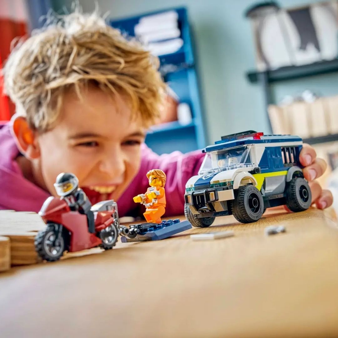 - JAILBREAK ESCAPES – Kids can put the police driver minifigure in the toy van, lock crooks in the onboard cell and use the model motorcycle hook to pull off the cell door for epic escape action