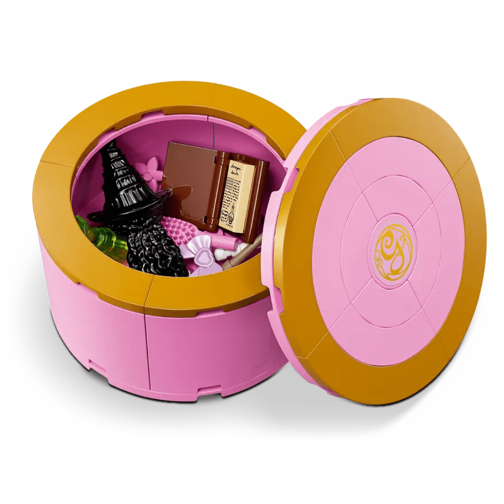 Kids scan the set’s hidden QR code to access unique LEGO® Wicked content and sing along to the “Popular” hit from the film. By placing the mini-dolls on the spinning stand, kids make the characters ‘dance’ along to the music! When the play is over, close the bedroom and transform it into Glinda’s trunk, which can be locked with a key!