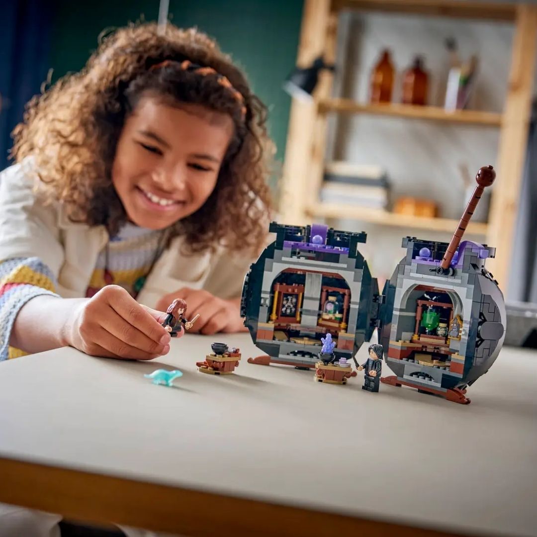 - SECRET CLASSROOM – Move the stirring stick and reveal the classroom with removable tables for easy play, a blackboard, potion bottles and LEGO® ingredients for Wolfsbane, Polyjuice and Love Potions