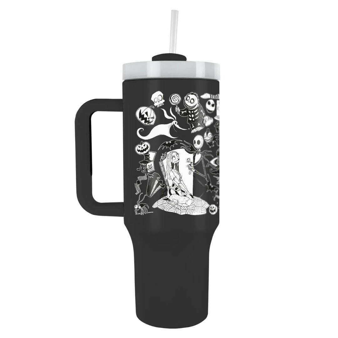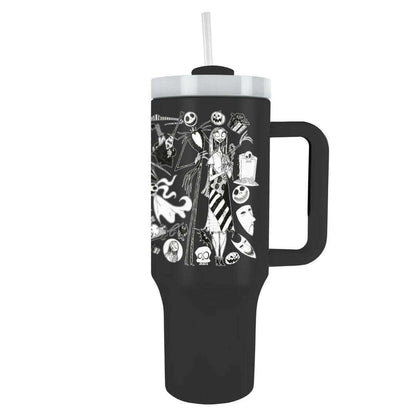 An officially licensed Nightmare Before Christmas 40oz tumbler is available to buy directly from the publisher with free UK delivery. This large 1200ml drink cup body is made from 304-grade stainless steel with double-walled vacuum insulation to keep your drinks hot or cold for approximately 7 and 11 hours, respectively. The travel mug will fit most cup holders, making this ideal for any journey. There is a silicon grip handle for a comfortable and safe hold. A full-cover lid offers sip-through drinking and a splash-resistant press-in straw. The lid is made from BPA-free plastic, ensuring your health and safety. An eco-friendly, stylish drinking tumbler, which is a great gift idea