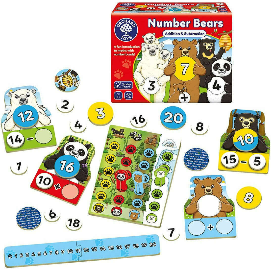 Number Bears is a combined learning activity and game in one. Players must get their bear safely home to their cubs by turning over number cards and solving mathematical problems in this fun number bonds game. But, be careful the bear doesn't get distracted by the yummy pot of honey or you'll have to miss a turn!!