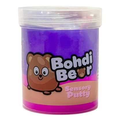 Bohdi Bear Sensory Putty, a delightful blend of purple and pink putty that promises a unique sensory experience. This butterslime-textured putty is not only visually appealing but also gently scented with a caramel fragrance, adding an extra touch of sweetness to your playtime. Each jar is adorned with bingsu beads and clay sprinkles, enhancing its charm and providing a fun tactile element.