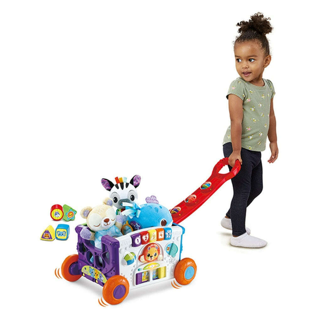Load up and get ready to roll with the Sort & Discover Activity Wagon, featuring four sides packed with exciting activities that will spark imagination and curiosity. Pull the wagon for on-the-go play and to trigger the motion sensor. The wagon is perfectly sized for toddlers to pull around their favourite toys. The light up activity panel introduce animals, numbers, colours and shapes. The gears, spinners, bead maze and shape sorting pieces support motor skills & hand eye coordination. Push or pull the wagon to develop important gross motor skills. The handle folds over the wagon for easy storage. Includes 18 melodies and 3 sing-along songs.